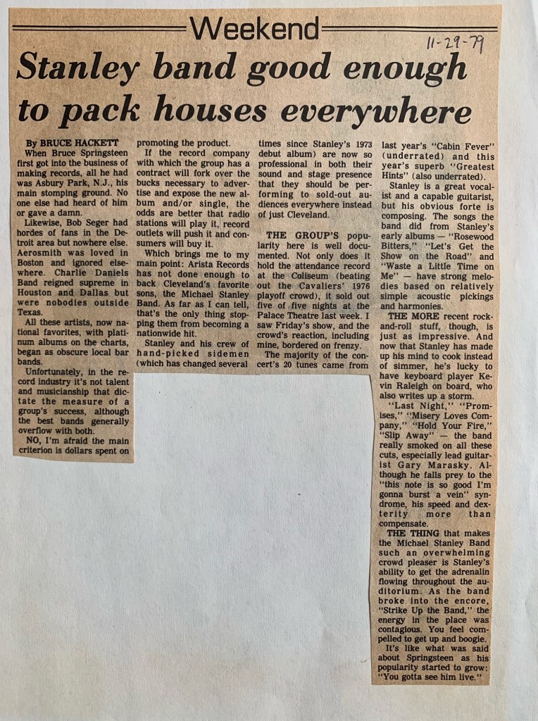 I saw MSB and or Stanley solo seven times in the ’70s and ’80s, often at Blossom as part of sold-out crowds. The electric atmosphere at those gigs reminded me of the rabid crowds at Springsteen shows. More recently, I saw him perform in December 2019 at MGM Northfield Park, and the place was packed with fervent fans who had clearly grown up with MSB’s music, and could (and did) sing along on damn near every song in the set list. It was those people I thought about this past week when the reality of Stanley’s death from lung cancer truly hit me.
