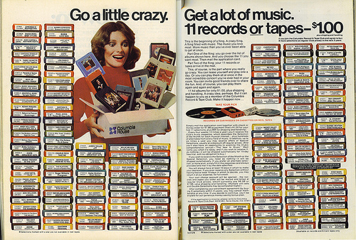 Readers who came of age in the 1970s will no doubt remember ads like the one shown below for Columbia House Record Club. They would hook us with “11 albums for $1.00” offers, which sounded too good to be true (which it was). We’d send in our dollar with a list of 11 albums (or tapes) we wanted from the list of titles, and we’d be overjoyed when they showed up in the mail a week or two later. But then they’d be after us to order more albums over the next several months, for which we’d be charged the retail amount. Some people tried to game the system; a guy in the 1990s was prosecuted for having received nearly 27,000 CDs, using over 2,000 fake accounts and 16 P.O. boxes!