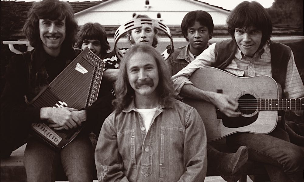 L-R: Graham Nash, drummer Dallas Taylor, Crosby in front with Stephen Stills behind, bassist Greg Reeves, Neil Young (1969)