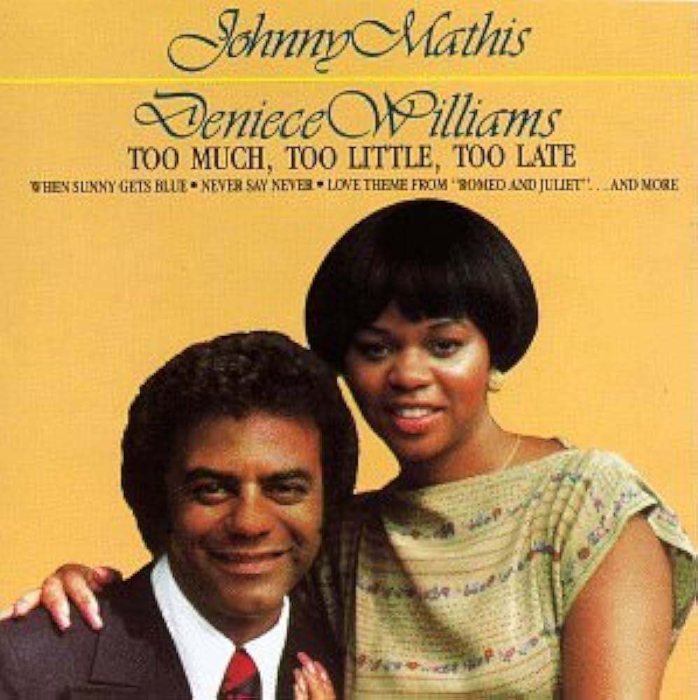 From 1956 to 1960, Mathis charted an astounding ten consecutive Top Ten albums, offering his soothing brand of what became known as “easy listening” music, notably “Chances Are,” “The Twelfth of Never” and “Misty.” In 1978, he found himself back at the top of the charts briefly with “Too Much, Too Little, Too Late,” a duet with Deniece Williams, in which the songwriting team of Nat Kipner and John Vallins hit just the right balance of affection and resignation in describing a long-time marriage that’s breaking up: “Yes, it’s over, the kids are gone, what’s the use of tryin’ to hang on? /Somewhere we lost the key, so little left for you and me, and it’s clear to see, /Too Much, Too Little, Too Late to try again with you…”