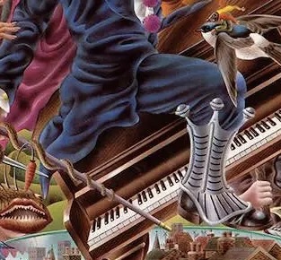Alan Aldridge was a London-based artist/illustrator/designer who had four claims to fame. He created the two editions of the well-known “The Beatles Illustrated Lyrics” books; he was responsible for creating the original art for The Rolling Stones’ iconic “tongue and lips” logo; he served as chief illustrator for Penguin Paperback Books, conceiving dozens of designs for science fiction novels; and in 1975, his work graced the cover of Elton John’s #1 LP “Captain Fantastic and the Brown-Dirt Cowboy.” Inspired by Dutch painter Hieronymus Bosch’s famous “Garden of Earthly Delights,” Aldridge depicted many dozens of items and artifacts from the life stories of John and lyricist Bernie Taupin.