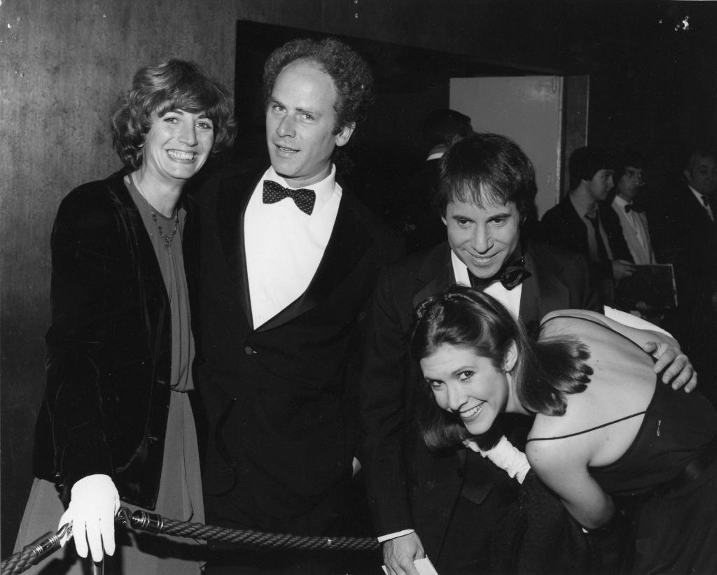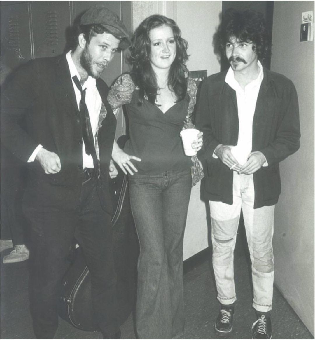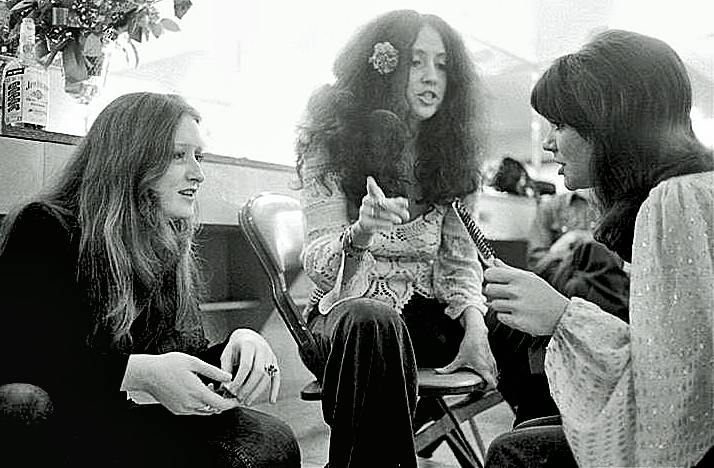 Bonnie Raitt, Maria Muldaur and Linda Ronstadt huddle at the Hollywood Bowl, 1974