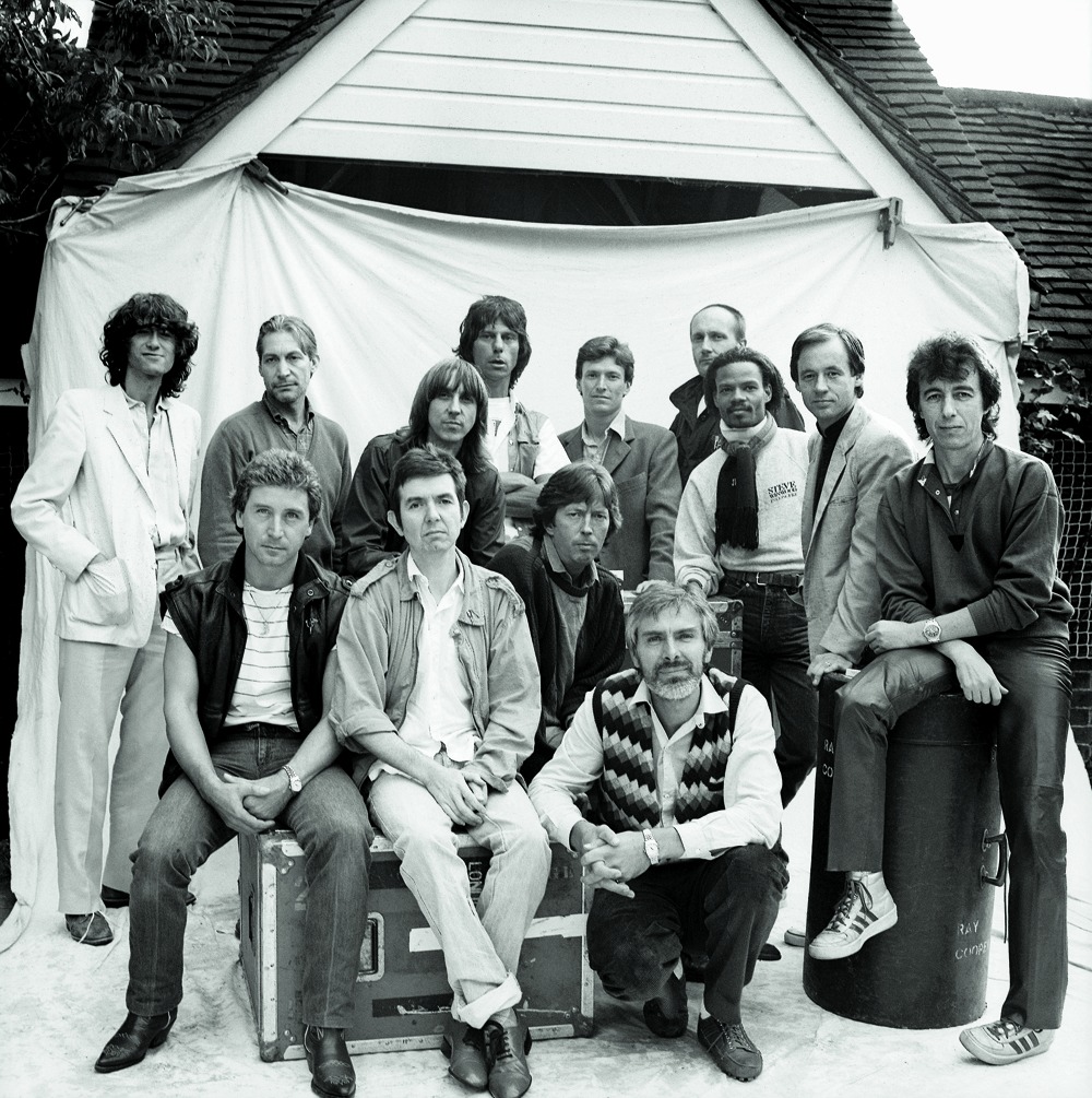 In 1983, this all-star assemblage of some of rock’s best and brightest assembled for a benefit concert for Ronnie Lane of Small Faces, who had been diagnosed with multiple sclerosis. Seated: Kenny Jones, Lane, Eric Clapton, producer Glyn Johns (squatting), Bill Wyman. Standing: Jimmy Page, Charlie Watts, Ian McLagan, Jeff Beck, Steve Winwood, Ray Cooper, Fernando Saunders, Andy Fairweather-Low.
