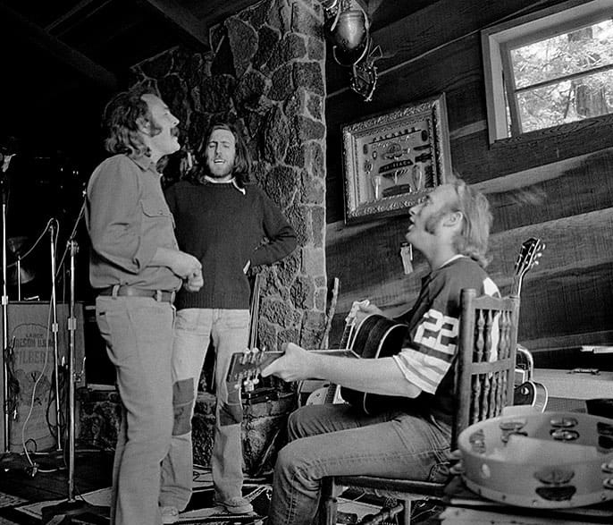 Crosby, Nash and Stills rehearsing for the CSNY Stadium Tour, 1974