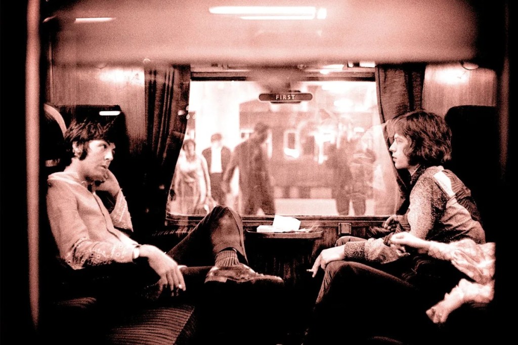 Paul McCartney and Mick Jagger on a train in England, 1967