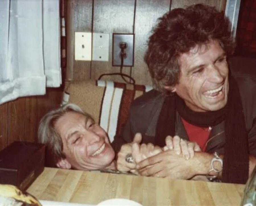 Charlie Watts and Keith Richards goof around in a New York pub booth, 1995